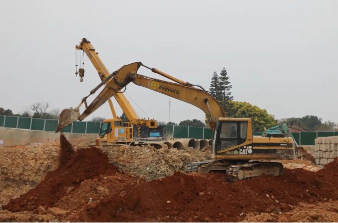 在泉州演艺剧场综合体及商业配套街区项目现场,工程车辆来回穿梭,挖掘机平整土地,打桩机快速运转,机械声轰鸣作响;工人们有条不紊地在各自岗位上忙碌,为后续工序做好准备,现场一派热火朝天的施工场景。