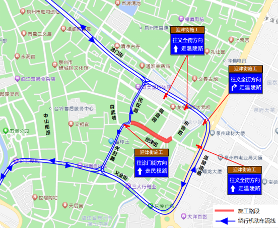 机动车可通过涂门街、温陵路、义全街、民权路、天后路等绕道行驶。