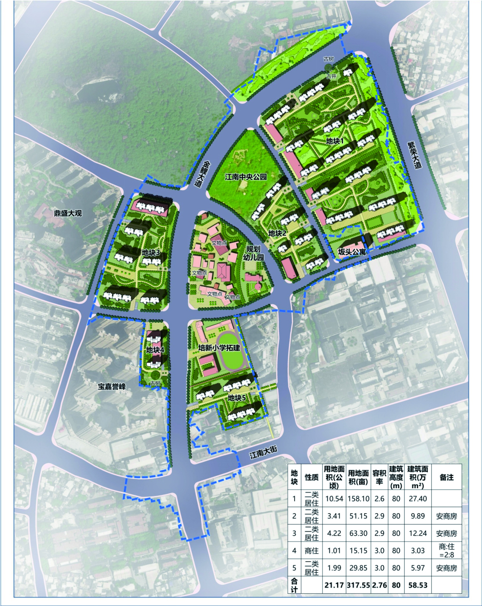 以金鲤大桥和金鲤大道建设为主线,规划用地面积749亩,综合考虑地块出让、群众安置、文物和老建筑保护等的规划布局,对沿路区域实施更新改造,计划总投资43亿元。片区内规划:可出让住宅/商住用地(317亩)、商业用地(35亩)、小学用地(30亩)、幼儿园用地(14亩),其余为道路、公园绿化等用地。其中,金鲤大桥全长1.97公里;金鲤大道全长约2.2公里,宽度50米,双向6车道。