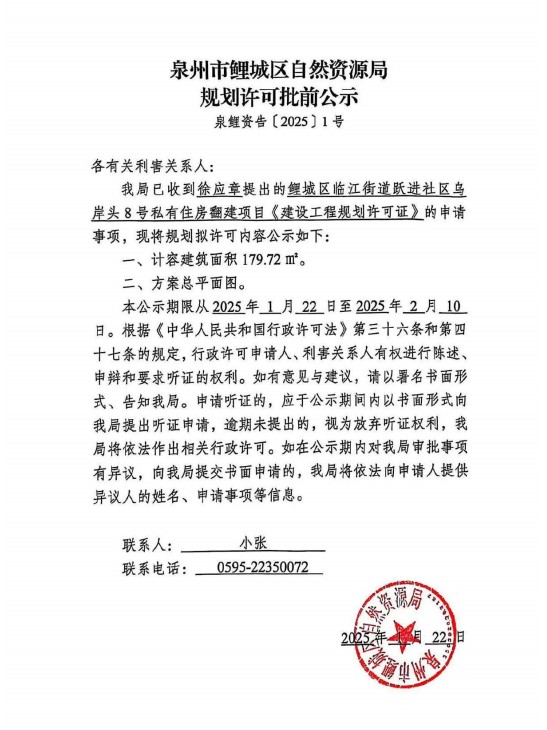 [规划许可]鲤城区临江街道跃进社区乌岸头8号私有住房翻建项目《建设工程规划许可证》批前公示
