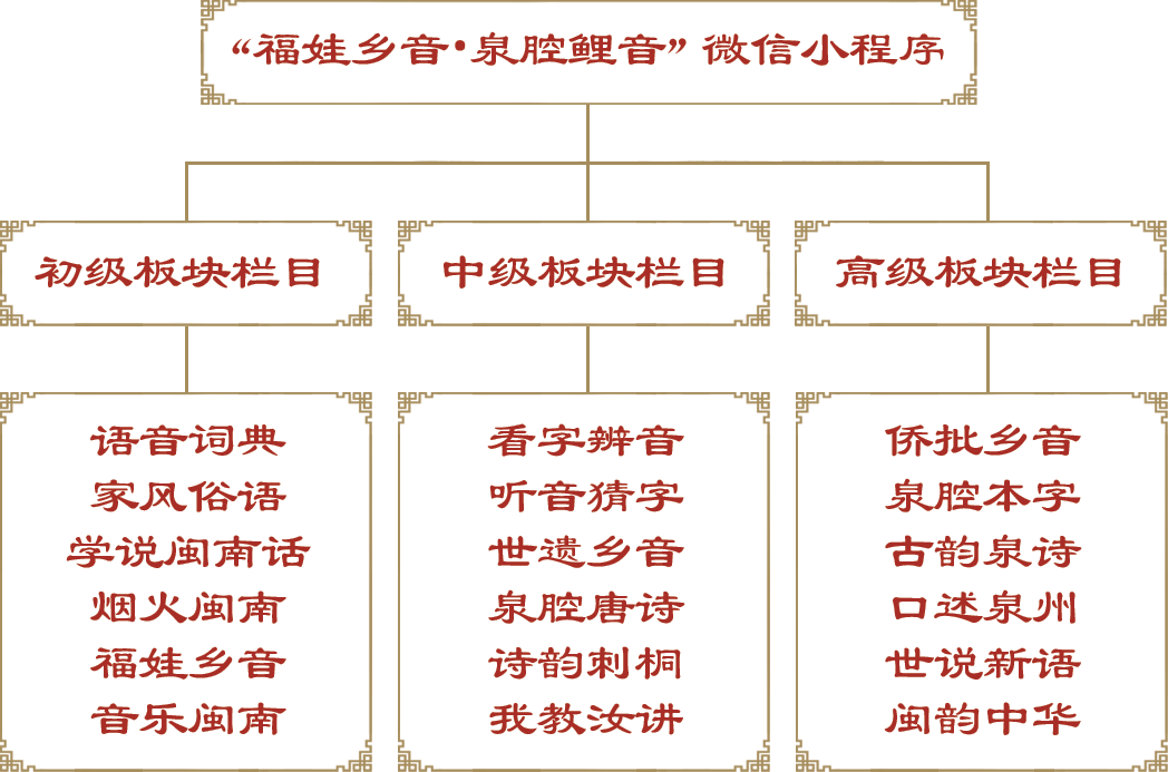 “福娃乡音·泉腔鲤音”闽南语公益自学平台是由中共泉州市委宣传部指导,中共鲤城区委宣传部、鲤城区社科联主办,丝路语言文化研究中心(泉州师院)提供专业学术指导,线上+线下相结合的立体化闽南语公益自学平台,线上以“福娃乡音·泉腔鲤音”微信小程序为载体,设置多元课程、互动体验、语音词典三大模块。多元课程模块将侨批、诗词、童谣、音乐、俗语等闽南语音视频作品阶梯式呈现给用户;互动体验模块通过设置线下活动报名、线上闽南语闯关游戏等内容,吸引用户参与互动;语音词典模块可以提供普通话对应闽南语的快速查询功能,为公众提供闽南语语音检索服务。