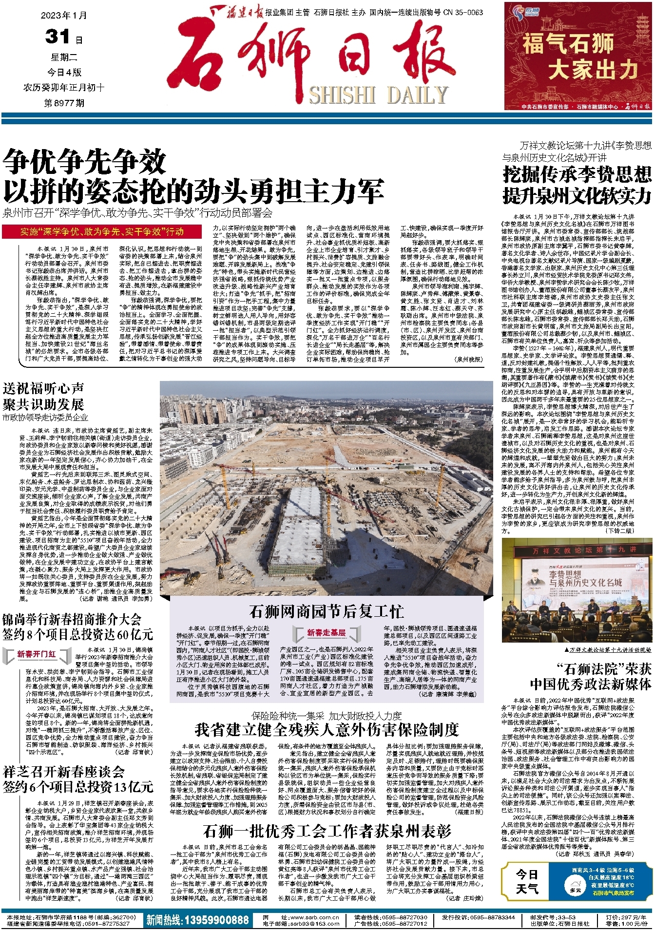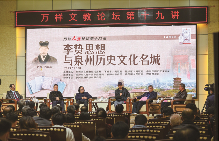 1月30日下午,万祥文教论坛第十九讲《李贽思想与泉州历史文化名城》在石狮市万祥图书馆报告厅开讲。泉州市委常委、宣传部部长、统战部部长陈辉宗,泉州市古城老城指挥部指挥长朱启平,泉州市政协原副主席李冀平,石狮市委书记黄春辉,著名文化学者、诗人余世存,中国纪录片学会副会长、中央电视台著名文献纪录片导演、国家一级编剧夏蒙,香港著名文学家、出版家、泉州历史文化中心第三任理事长孙立川,泉州市经贸技术学院党委原书记郑文伟,华侨大学教授、泉州李贽学术研究会会长陈少牧,万祥图书馆创办人、董酒股份有限公司董事长蔡友平,泉州市社科联主席李培德,泉州市政协文史委主任张文卫,共青团福建省委一级调研员蔡丽芳,泉州市政府发展研究中心原主任胡毅雄,鲤城区委常委、宣传部部长陈志雄,石狮市委常委、宣传部部长郑天助,石狮市政府副市长黄明瑄,泉州市文旅局副局长出宝阳,董酒股份有限公司总裁蔡少韧,以及泉州市、鲤城区、石狮市有关单位负责人,嘉宾、听众等参加活动。