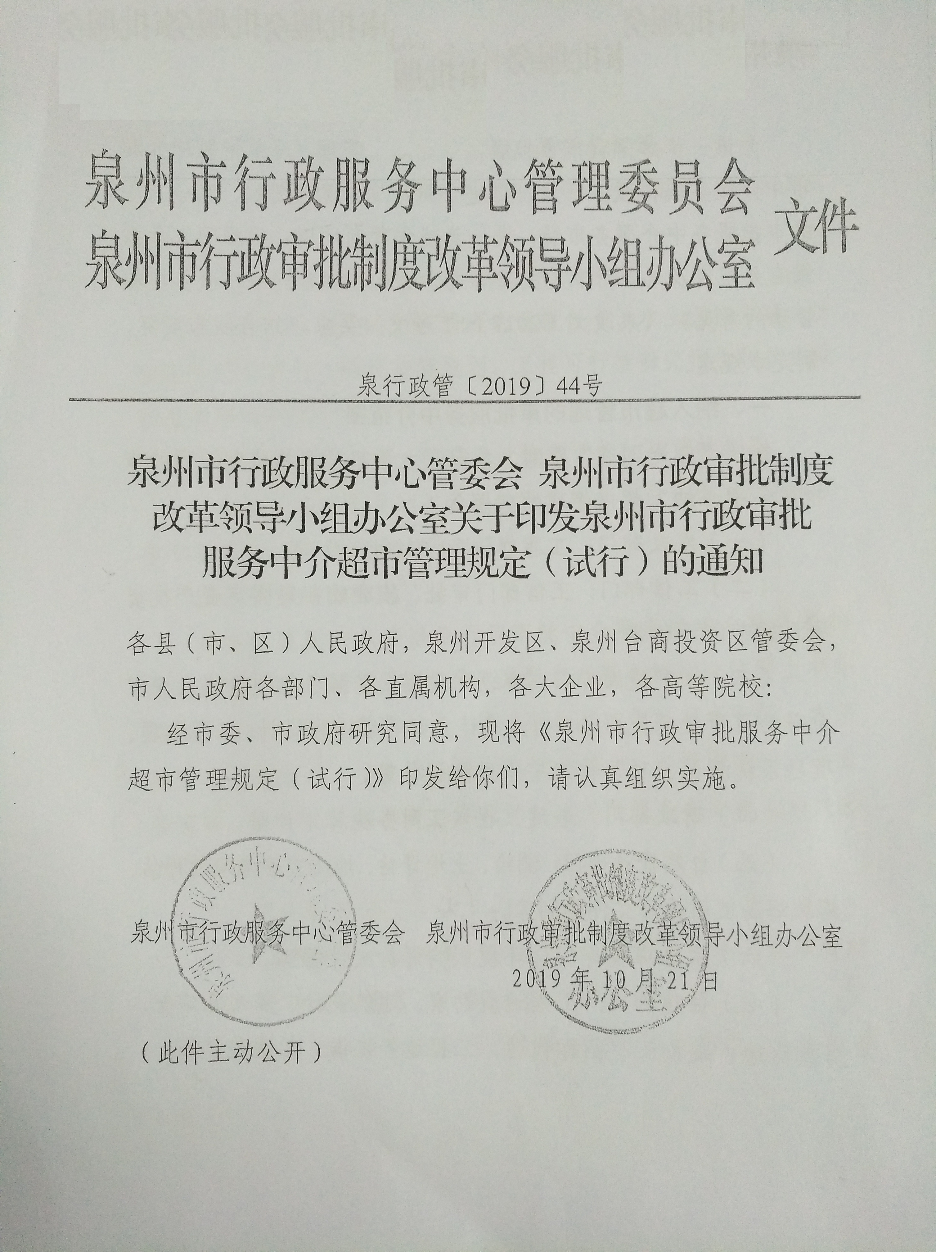现将《泉州市行政服务中心管委会 泉州市行政审批制度改革领导小组办公室关于印发泉州市行政审批服务中介超市管理规定(试行)的通知》转发给你们,请认真组织学习,并狠抓贯彻落实。