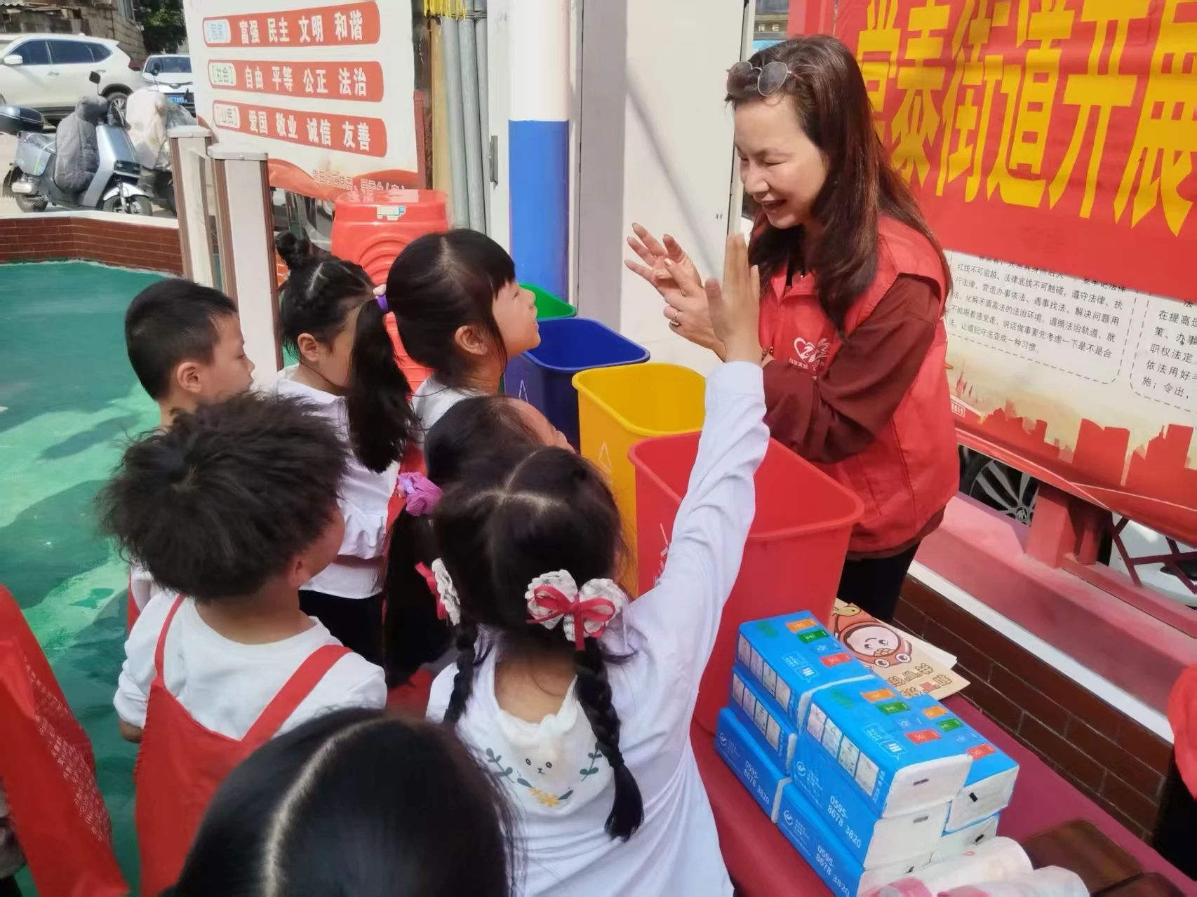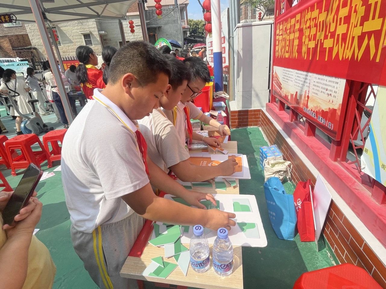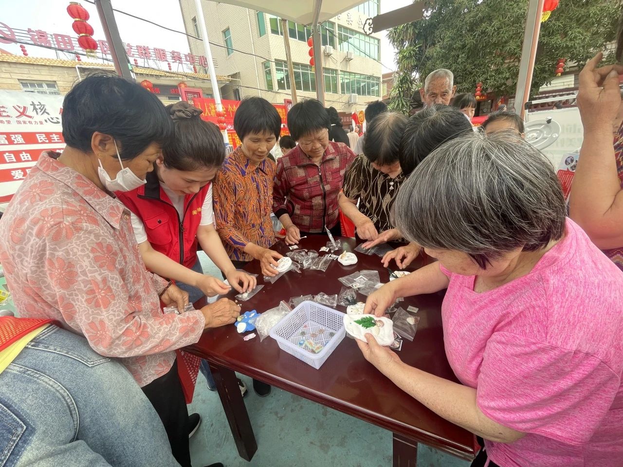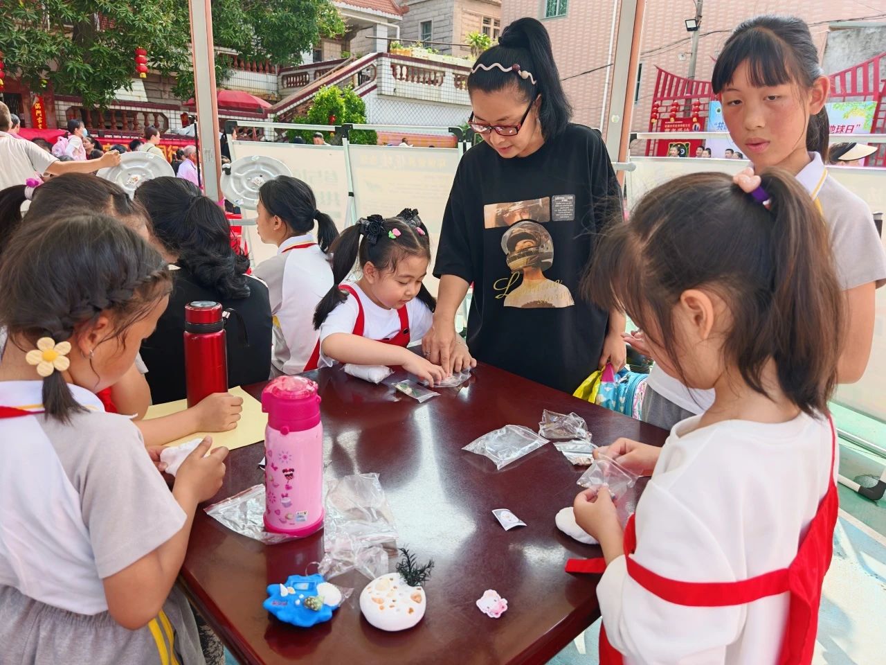 广场东侧,4块环保主题移动展板构筑起知识长廊。在垃圾分类宣传区,志愿者正讲解着生活垃圾细分口诀。环保绘画作品展前,志愿者为小朋友们讲解画作里“碳中和”的奥秘。在河长制宣传区,宣传员向居民们科普河长制相关知识及政策。最热闹的当属闽台缘博物馆展位,孩子们和爷爷奶奶们正用贝壳、橡皮泥制作环保主题冰箱贴,“看!我的贝壳在太阳底下会发光!”10岁的小杰举着作品欢呼。