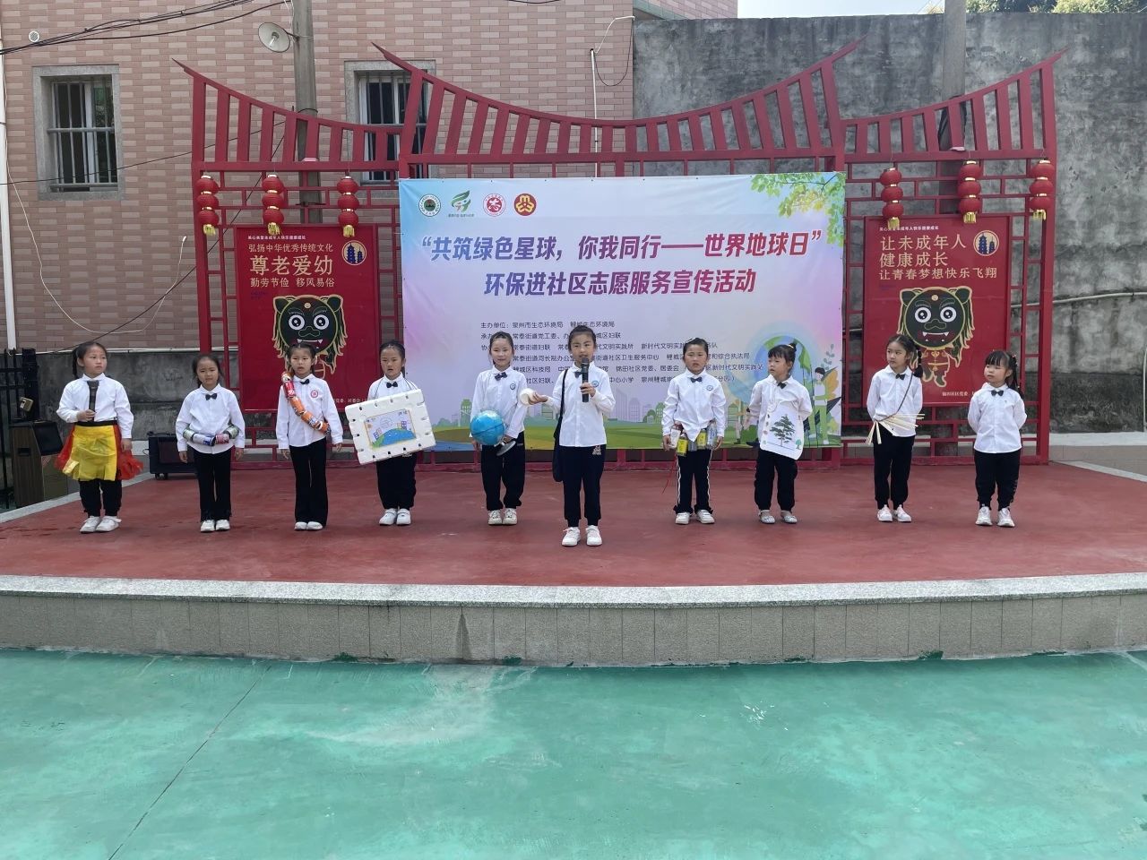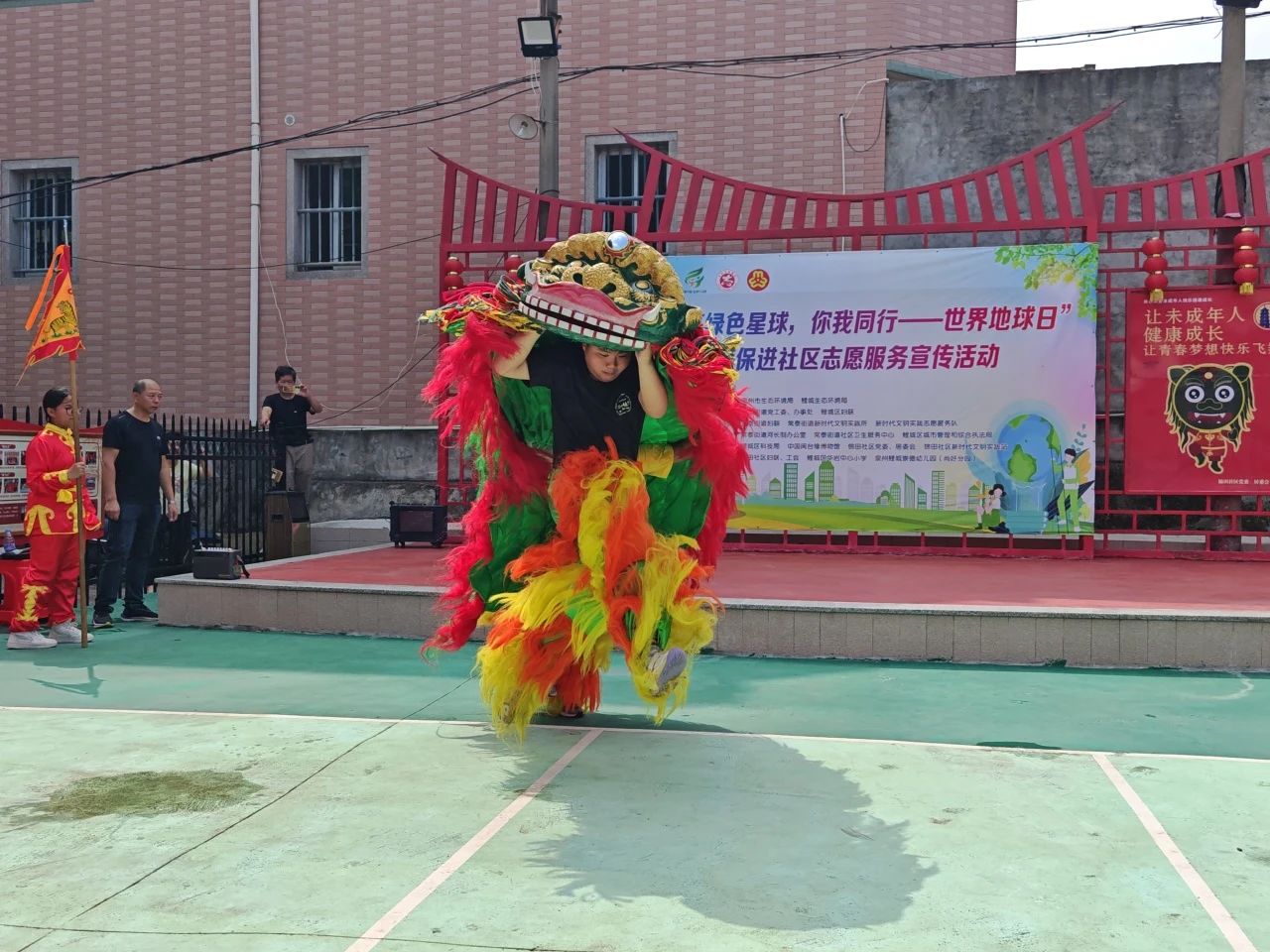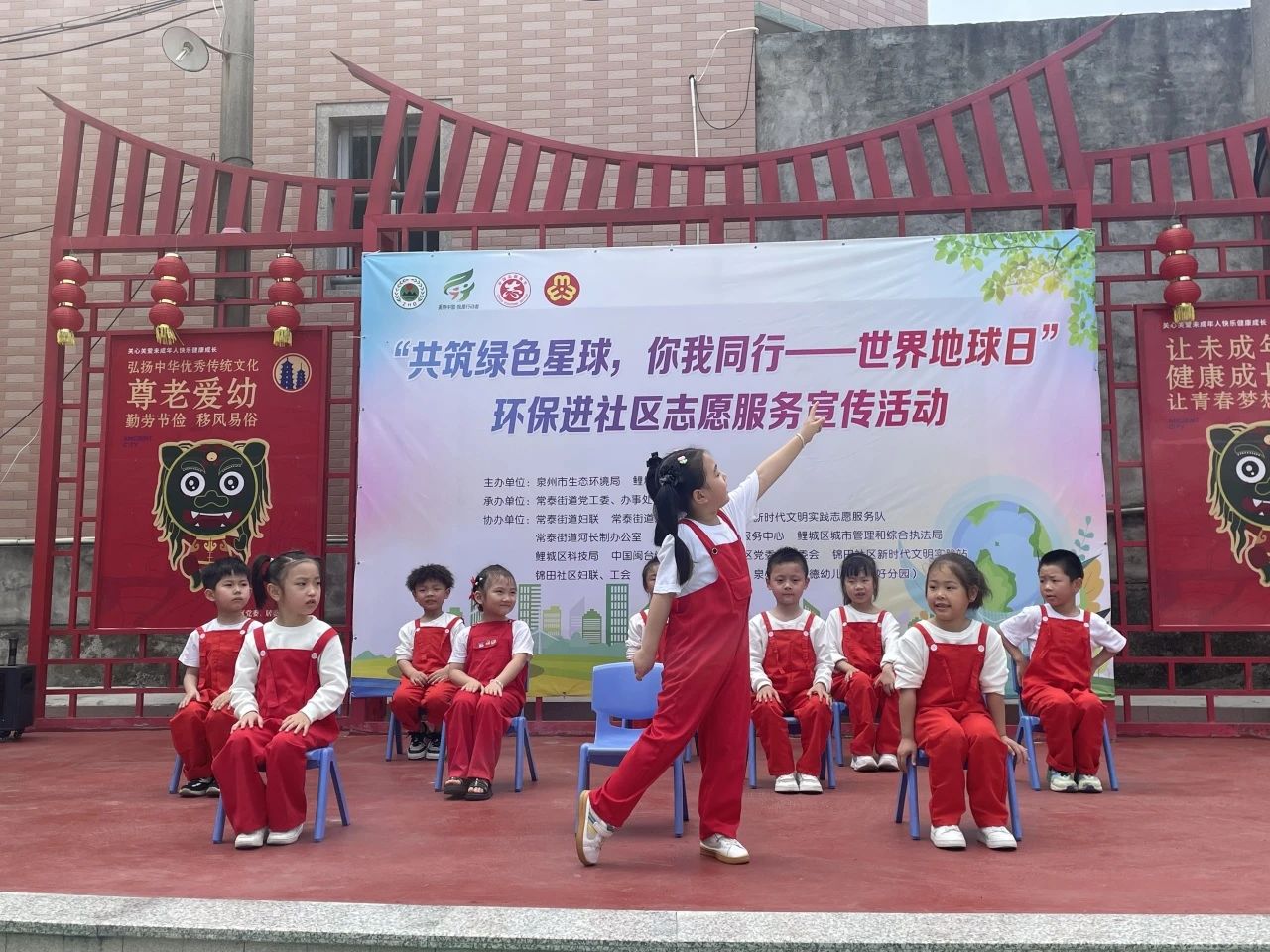 舞台区则洋溢着童趣与古韵的交响。华岩中心小学学子热情饱满地吟诵《给地球妈妈的信》,稚嫩声线里饱含对地球母亲的热爱。崇德幼儿园尚好分园的萌娃们则化身“环保小卫士”,用情景剧演绎环境保护趣事。闽南古韵《跳皮筋》将环保口号编入童谣,孩子们灵动的舞步跳出了绿色新时尚。最后,华岩小学的孩子们带来的刣狮表演压轴登场,传统民俗与环保主题的碰撞引发阵阵喝彩。