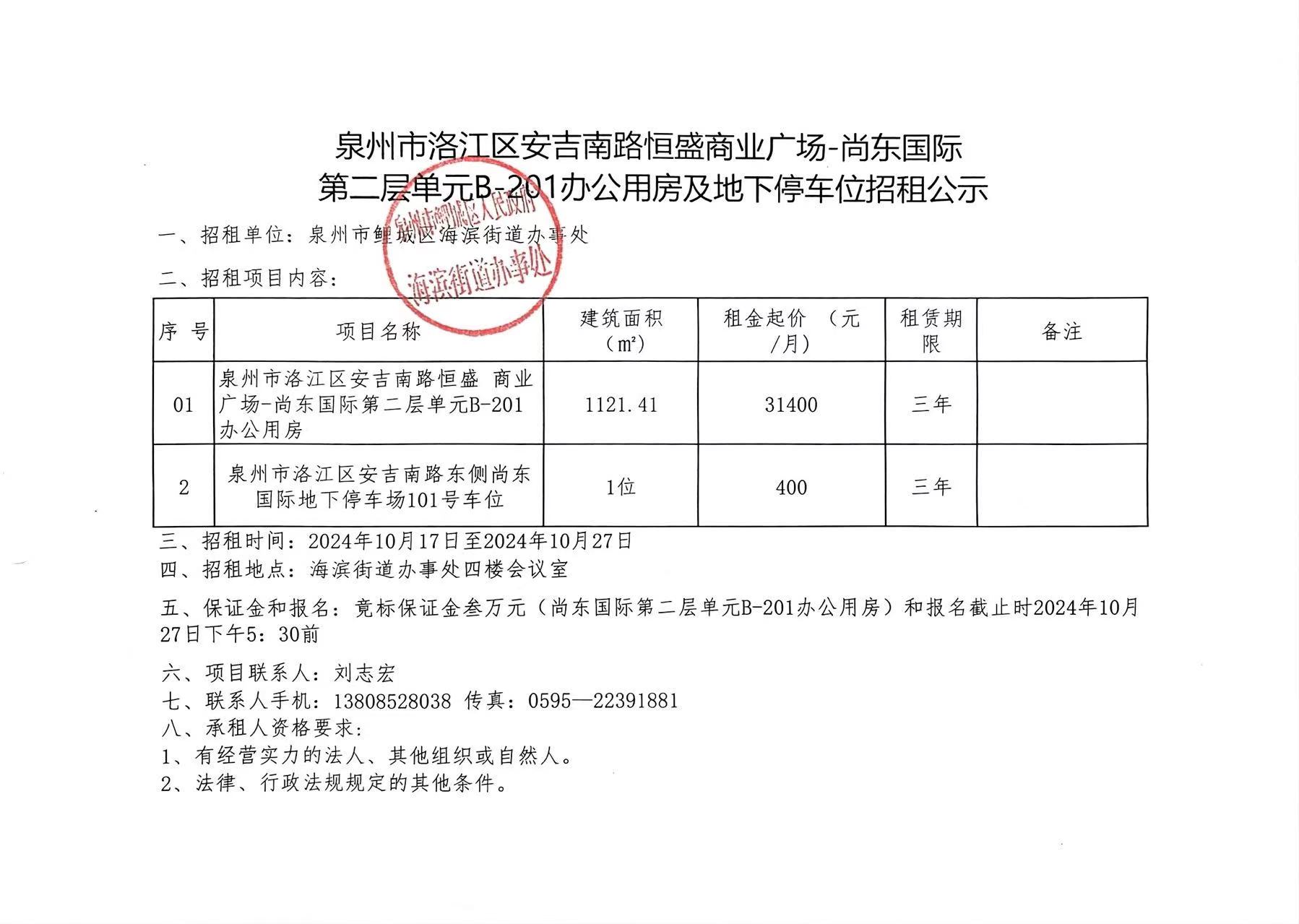 泉州市洛江区安吉南路恒盛商业广场-尚东国际第二单元B-201办公用房及地下停车位招租公示