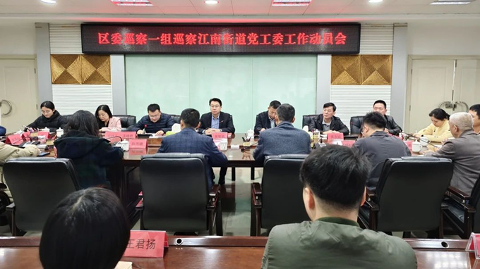 区委巡察一组副组长黄永瑜、郑小蓉及有关同志,江南街道党工委领导班子成员及其他区管干部出席会议,江南街道党工委内设股室、下属单位主要负责人、部分退休老同志列席会议。