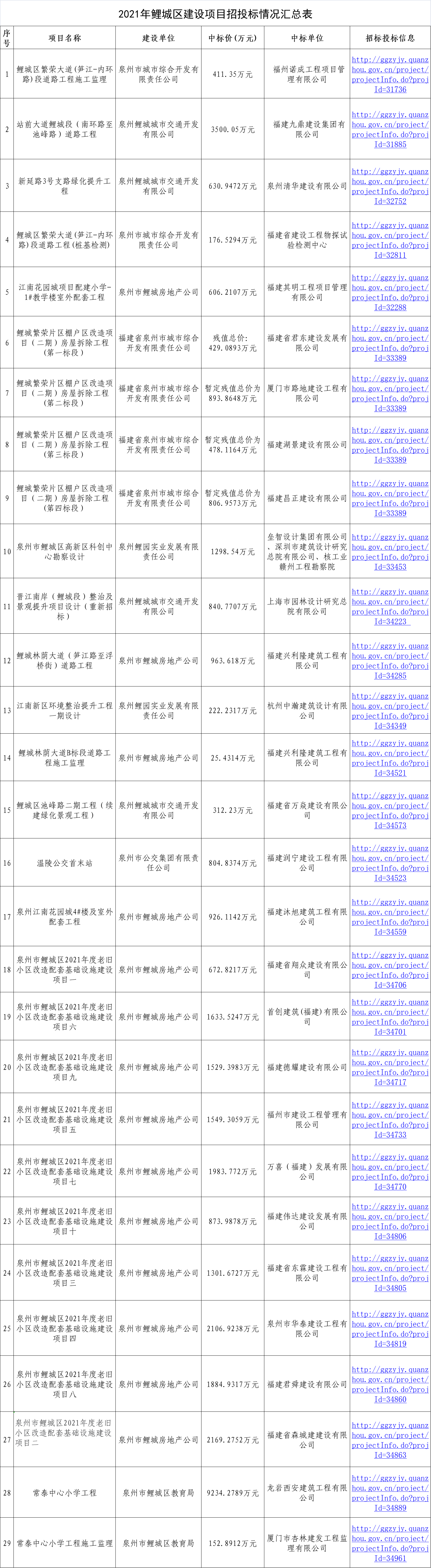 2021年鲤城区建设项目招投标情况汇总表