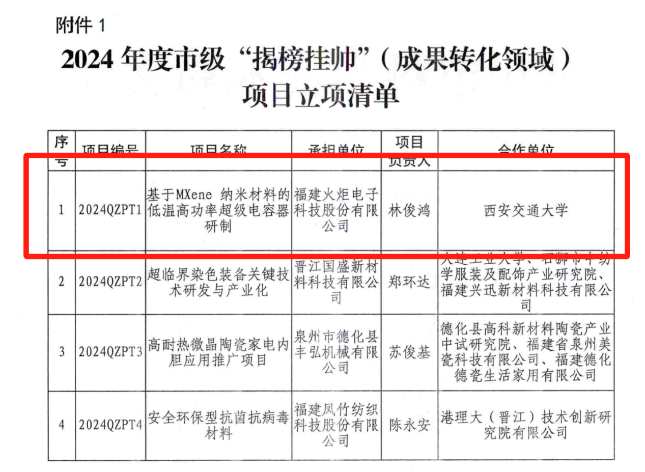 近日,泉州市科技局公布2024年度市级“揭榜挂帅”科技重大专项(成果转化领域)项目立项清单。其中,我区推荐的火炬电子与西安交通大学合作的“基于MXene纳米材料的低温高功率超级电容器研制”项目列入立项名单。