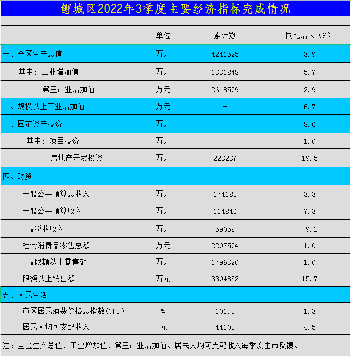 鲤城区2022年3季度主要经济指标完成情况