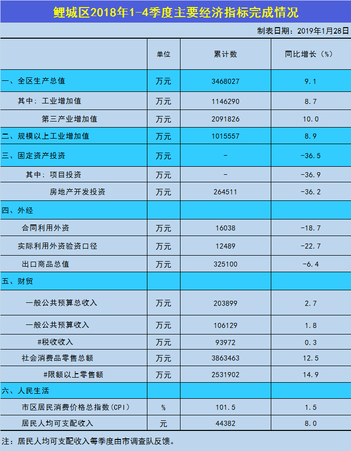 鲤城区2018年1-4季度主要经济指标完成情况