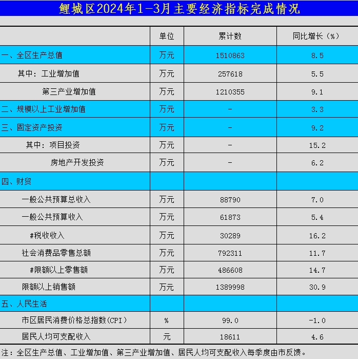 鲤城区2024年1-3月份主要经济指标完成情况