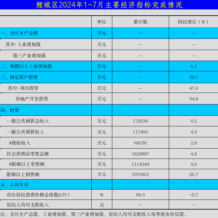 鲤城区2024年1-7月份主要经济指标完成情况