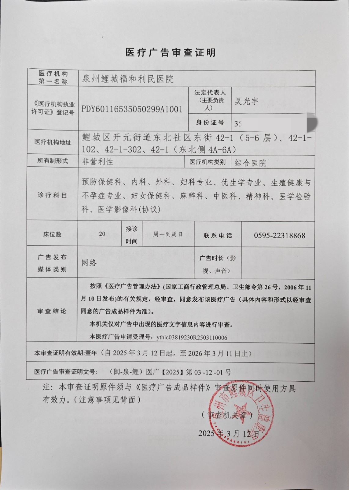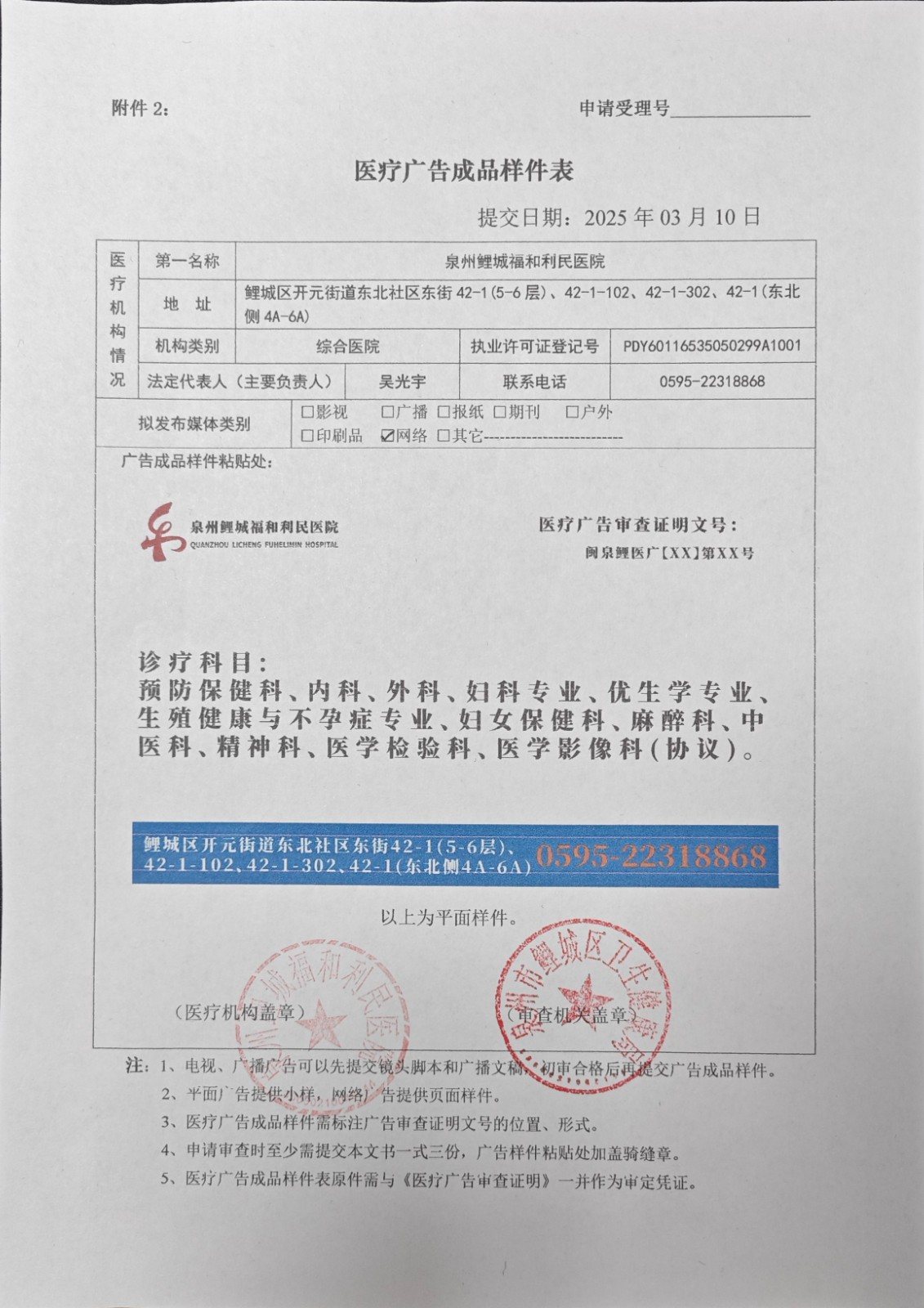 根据要求,现将泉州鲤城福和利民医院《医疗广告审查证明》及《医疗广告成品样件表》予以公示。