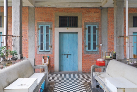 洋楼分主后楼,主楼建成10年后才建的后楼,两栋楼以天桥相连,地上铺设着当年从印尼海运来的黑白瓷砖,加上颇有地中海风的蓝色门窗、闽南风的烟炙砖,中外建筑元素混搭,却丝毫不见造作,反而搭配得熨帖自然。天桥上还砌筑了石质长条靠椅,是绝佳的纳凉场所。